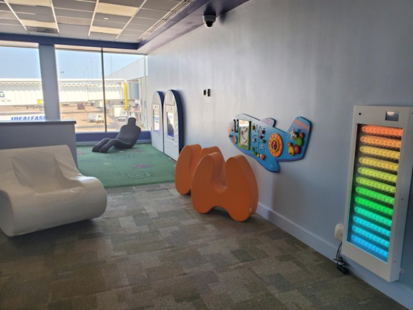 Soft furniture and squeezy chairs\Furniture in the sensory room invite children to plop down and relax.Therapy rocker\The therapy rocker providers gentle movement for children.Interactive walls\One wall plays animal sounds or music as a child places their hand on the wall. The other wall lights up with interesting and calming colors.Bubble tube\The green bubble tube provides children with the opportunity to focus on visual movement.Small house\This small, soft house is for kids who need their own hide-out before or after a busy flight.Where is the sensory room located?\The room is located next to the Over the Rhine Market in Concourse A and diagonal from Starbucks.CVG strives to provide a safe, welcoming, and accessible journey to all travelers. For questions about accessibility, [click here] or [email info@cvgairport.com](mailto:info@cvgairport.com).Read more